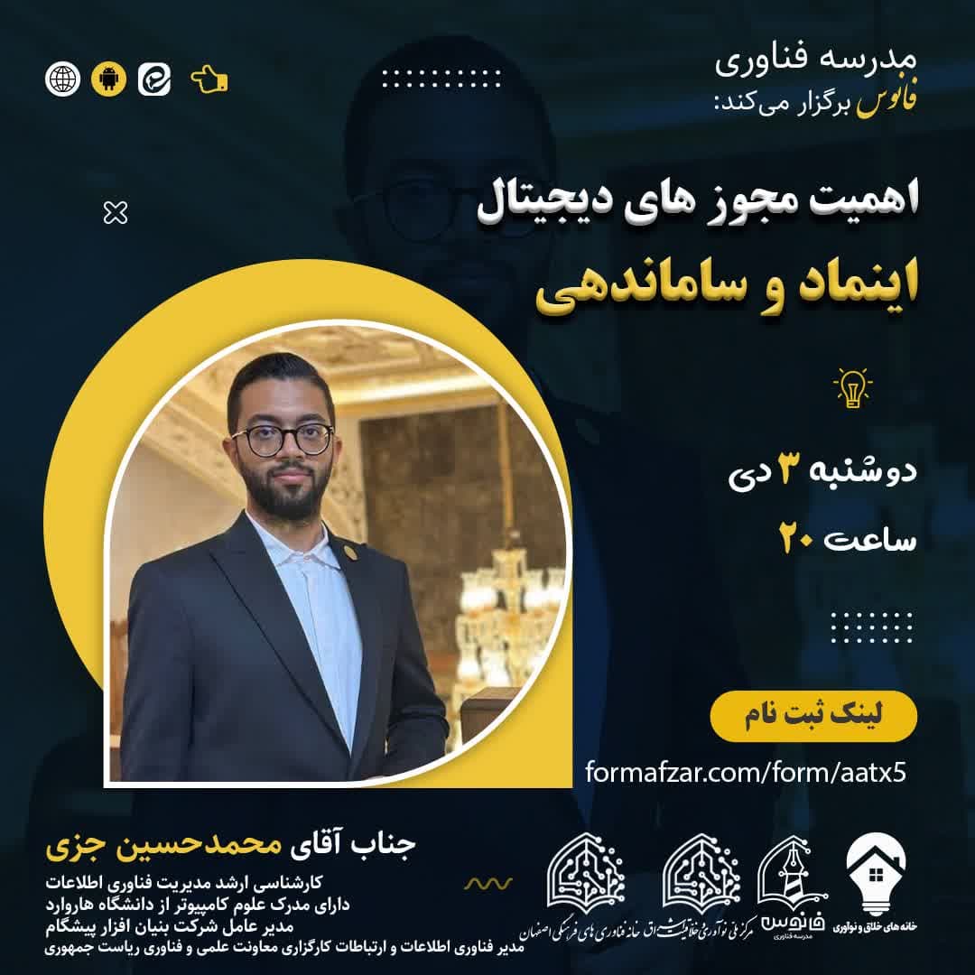 وبینار: اهمیت دریافت مجوزهای دیجیتال (اینماد و ساماندهی) ghorbani 4 دی 1403 مدرس: جناب آقای محمدحسین جزیکارشناسی ارشد مدیریت فناوری اطلاعاتدارای مدرک علوم کامپیوتر از دانشگاه هارواردمدیر عامل شرکت بنیان افزار پیشگاممدیر