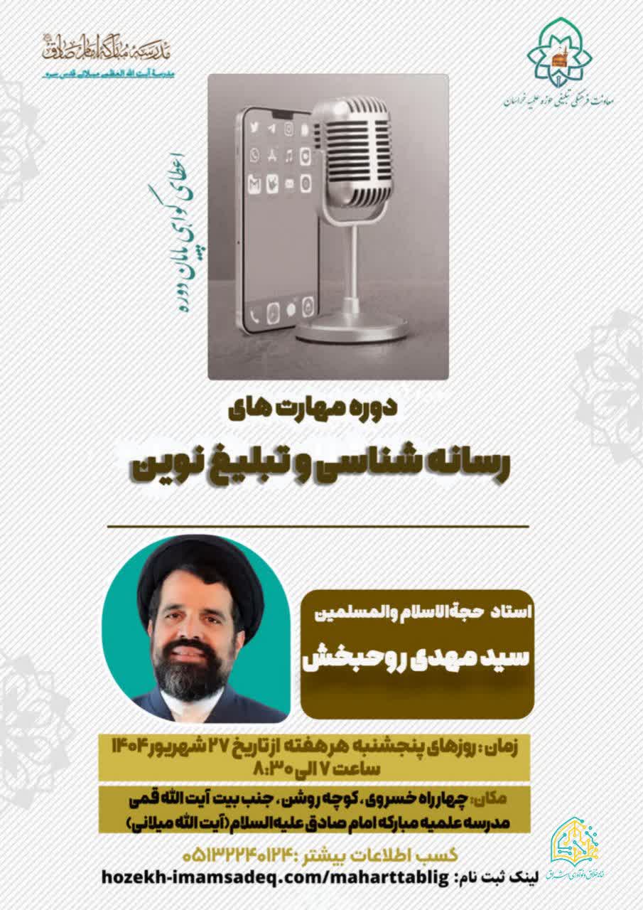 دوره مهارتهای رسانه و تبلیغ نوین admin_house 23 شهریور 1404 برگزاری کارگاه «رسانهشناسی و روشهای نوین تبلیغ دینی» کارگاه آموزشی با عنوان «رسانهشناسی و روشهای نوین تبلیغ دینی» به همت